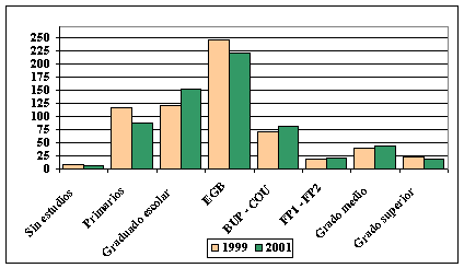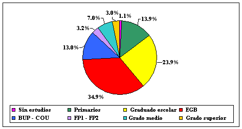 En cuanto al la formación de la población desempleada, debido a la juventud del colectivo y la obligatoriedad de la enseñanza básica, la inmensa mayoría de los parados de la comarca cuentan como mínimo con estudios primarios. De hecho el 14 % de la población inscrita posee estudios primarios, el 35 % cursó EGB y el 34 % el graduado escolar.