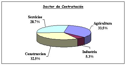 El 49 % de este volumen de contratos se hizo a hombres, siendo estos más numerosos para el hombre que para la mujer en los sectores de la construcción y los servicios, predominando la contratación femenina en la agricultura y la industria.