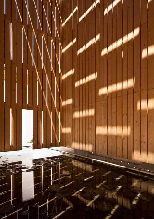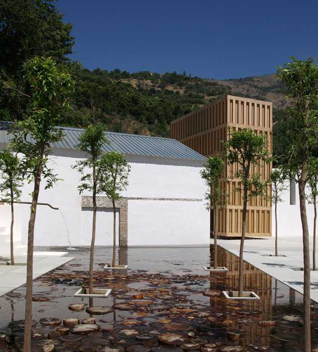 El ingreso se produce ocupando el patio del antiguo matadero con una nueva construcción en madera. Este pabellón alberga un espacio representativo dedicado al agua y se convierte en un hito de referencia en el paisaje. La construcción evoca la cubrición del Manantial de la Capuchina, una construcción del siglo XVIII realizada en madera que albergaba en su interior el primer nacimiento del agua en Lanjarón. El nuevo pabellón está concebido como un espacio de gran contenido sensorial, suspendido en el aire y con dos aperturas que permiten al visitante acceder al interior y participar de los efectos de luz y penumbra. Una lámina de agua extendida sobre el suelo refuerza aún más estas sensaciones, similares a las de los baños islámicos.