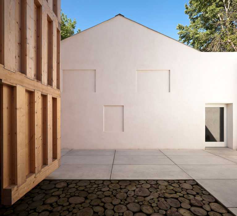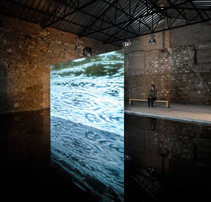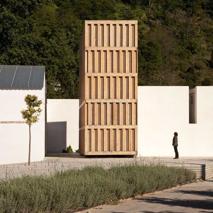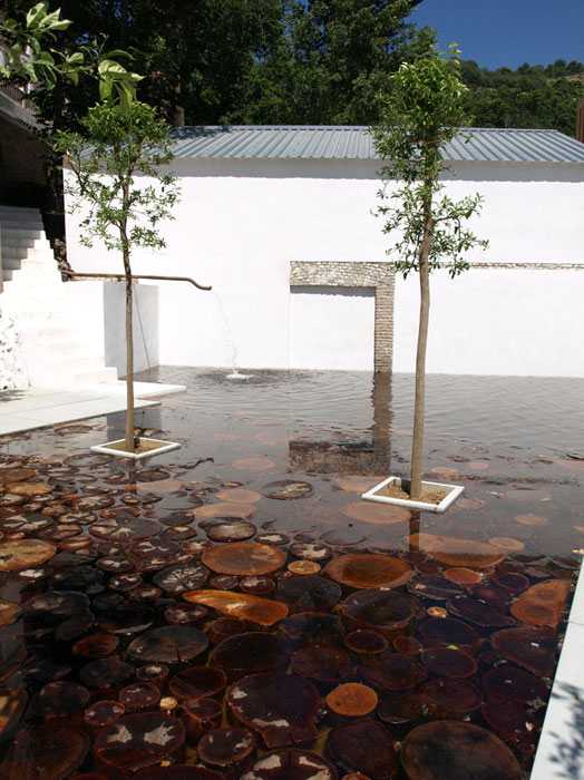 La reutilización y el reciclaje de arquitecturas y otros elementos del entorno, realizados con criterios ambientales, caracterizan esta intervención en la que el agua y las diferentes texturas de la madera de los vecinos eucaliptos, se convierten en protagonistas