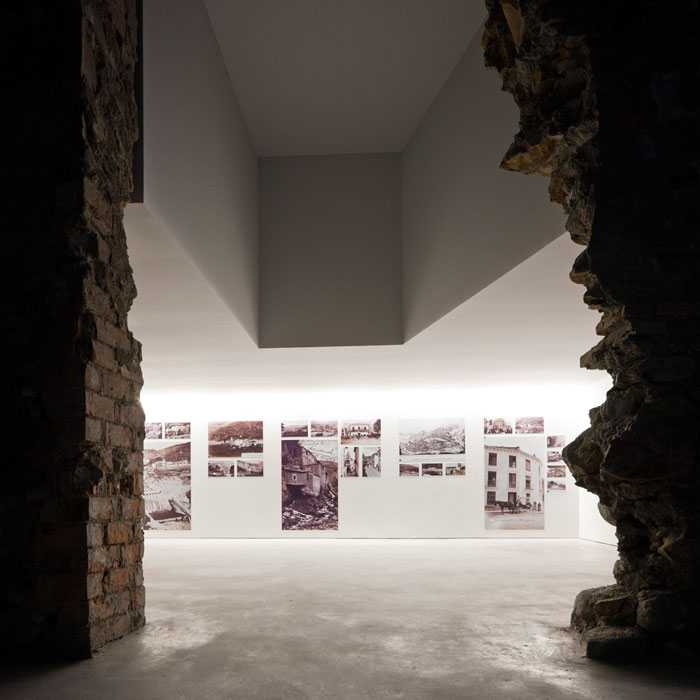Los espacios expositivos se han dispuesto mediante una ocupación selectiva del interior de las antiguas construcciones, dejando los corrales y otras dependencias inutilizados hasta futuras necesidades. Con el fin de contrastar los muros de piedra y ladrillo del antiguo molino, se han dispuesto de manera localizada paneles trasdosados en color blanco que enmarcan los lugares de la nueva intervención. Las dos naves principales se destinan a salas de audiovisuales y una tercera para exposición temática de contenidos. En la nave más antigua un vidrio con proyecciones sobre su superficie emerge del suelo inundado con agua de la acequia, creando un juego de reflejos sobre los antiguos muros del molino.