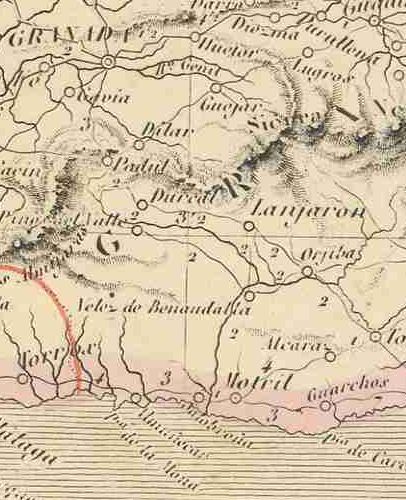 Granada a Motril (núm. 807) a 3 k. de Béznar Existe el proyecto de construir una carretera de tercer orden por los mismos puntos |