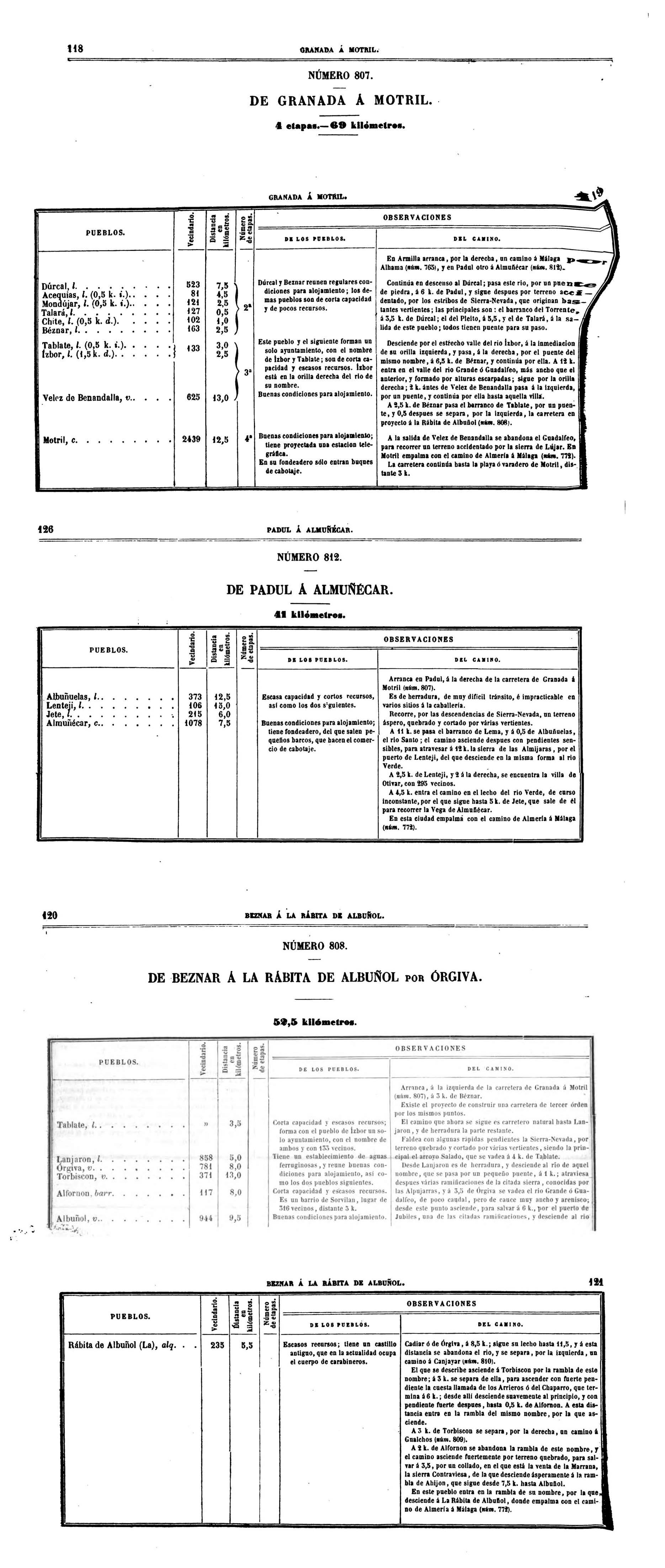 carretera Granada a Motril (núm. 807) Es de herradura, de muy dificil tránsito, e imprescindible en varios sitios la caballería Recorre, por las descendencias de Sierra-Nevada, un terreno áspero, quebrado y cortado por varias vertientes. A 11 k. se pasa el barranco de Lema, y a 0,5 de Albuñuelas, el rio Santo; el camino asciende despues con pendientes sensibles, para atravesar a 12 k. la sierra de las Almijaras, por el puerto de Lentaji, del que desciende en la misma forma al rio Verde A 2,5 k. de Lenteji, y 2 a la derecha, se encuentra la villa de Otivar, con 295 vecinos A 4,5 k. entra el camino en el lecho del rio Verde. de curso inconstante, por el que sigue hasta 5 k. de Jete, que sale de él para recorrer la vega de Almuñécar. En esta ciudad empalma con el camino de Almería a Málaga (núm. 712) |