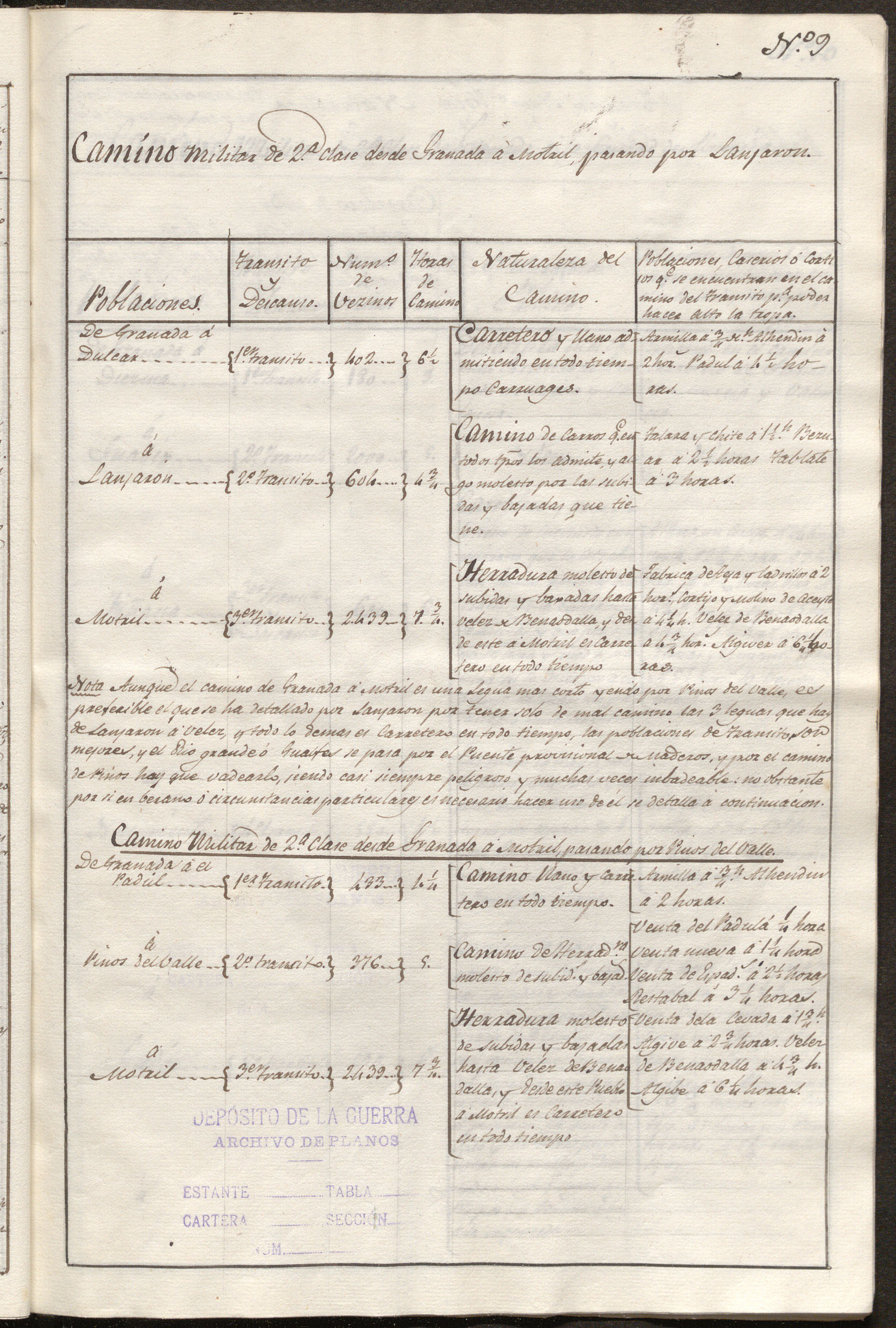 | Nota: Aunque el camino de Granada a Motril es una legua mas corto yendo por Pinos del Valle es preferible el que se ha detallado por Lanjaron por tener solo de mal camino las 3 leguas que hay de Lanjaron a Velez, y todo lo demas es carretero en todo tiempo, las poblaciones de transito son mejores, y el rio grande o Guadalfeo se pasa por el puente provisional en maderos, y por el camino de Pinos hay que vadearlo, siendo casi siempre peligroso y muchas veces imbadeable, no obstante por si en berano o circunstancias particulares es necesario hacer uso de él, se detalla a continuacion | |||||