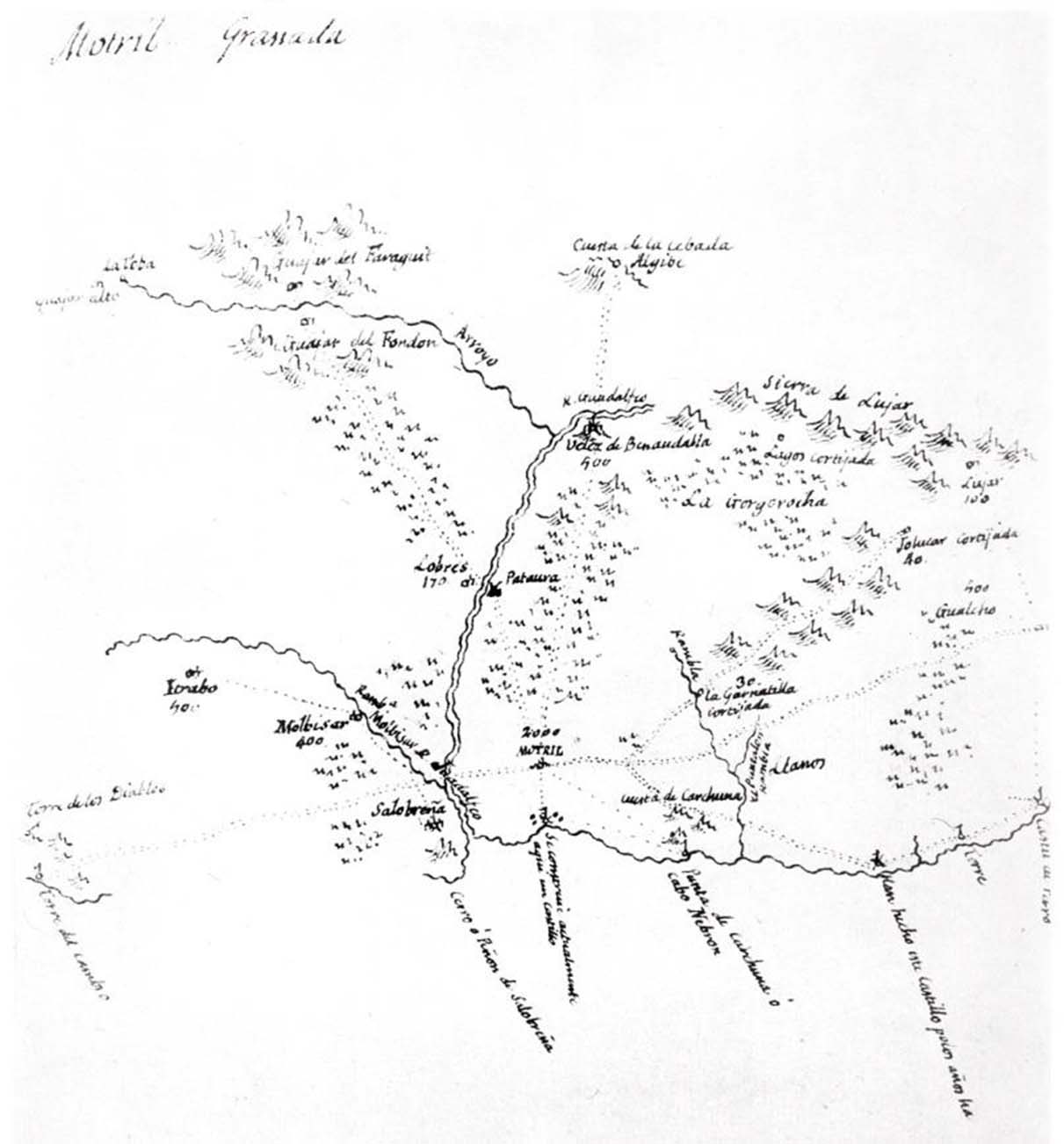 A su vez, en el término de Motril, el dibujo de Tomás López representa varios caminos que se irradian desde esta ciudad: al norte, el que enlaza el lugar de Pataura con Lobres pasando el río Guadalfeo y sube hasta la sierra de Las Guájaras.
