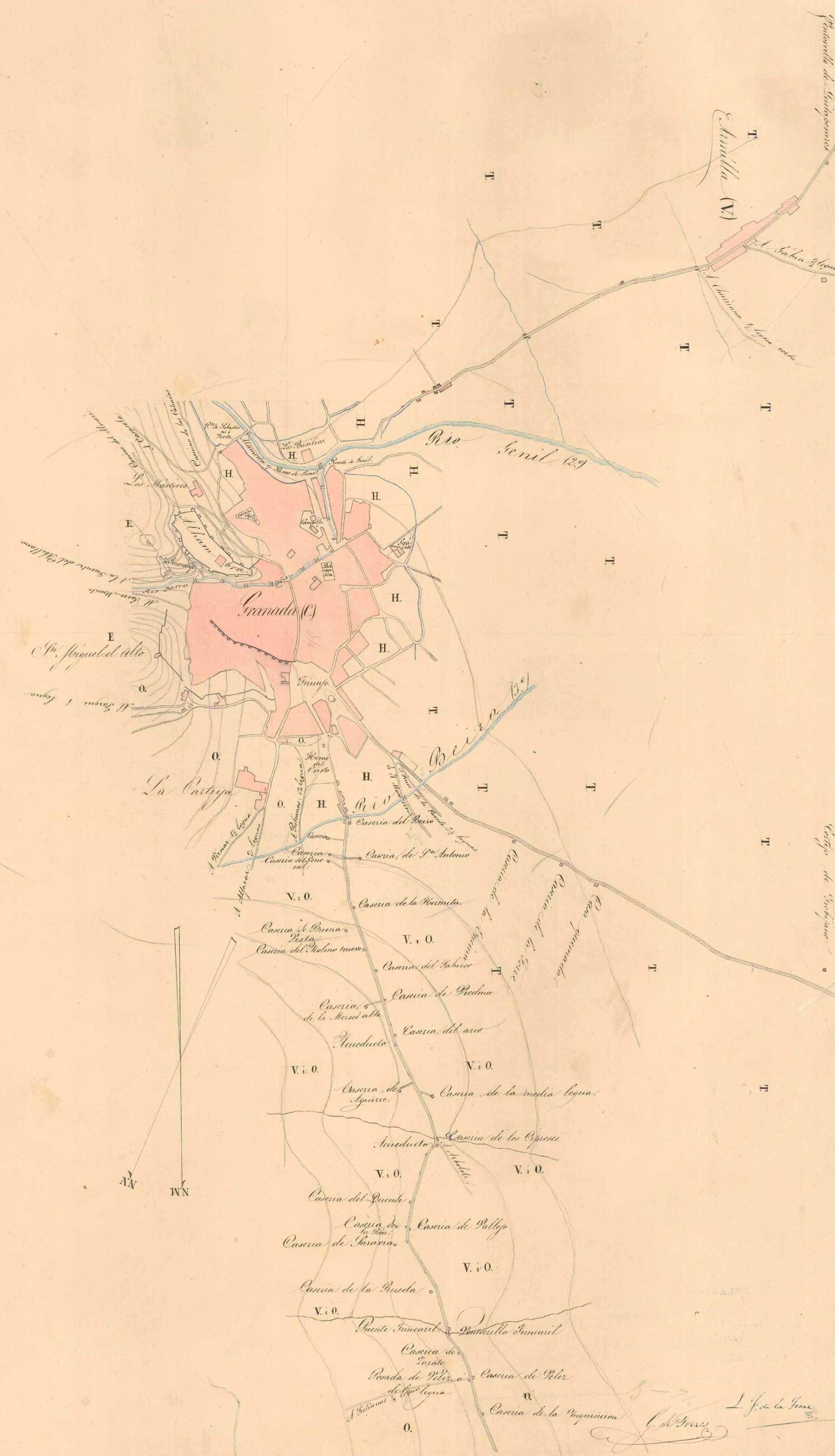 GranadaGranada entre el Genil y el Beiro. Por medio pasa el Darro sin embovedar. Resaltan los Jardines del Triunfo en construcción. La calle Elvira une Plaza nueva y estos jardines. Bajando por el Campillo y la Carrera de la Virgen de las Angustias se muestra el arranque de la carretera de Granada-Motril por Los Basilios hasta Armilla. El Genil y el Monachil se atraviesan con puente.