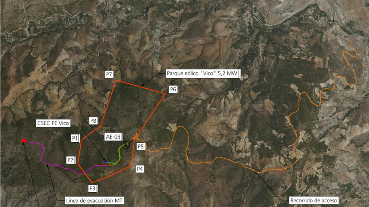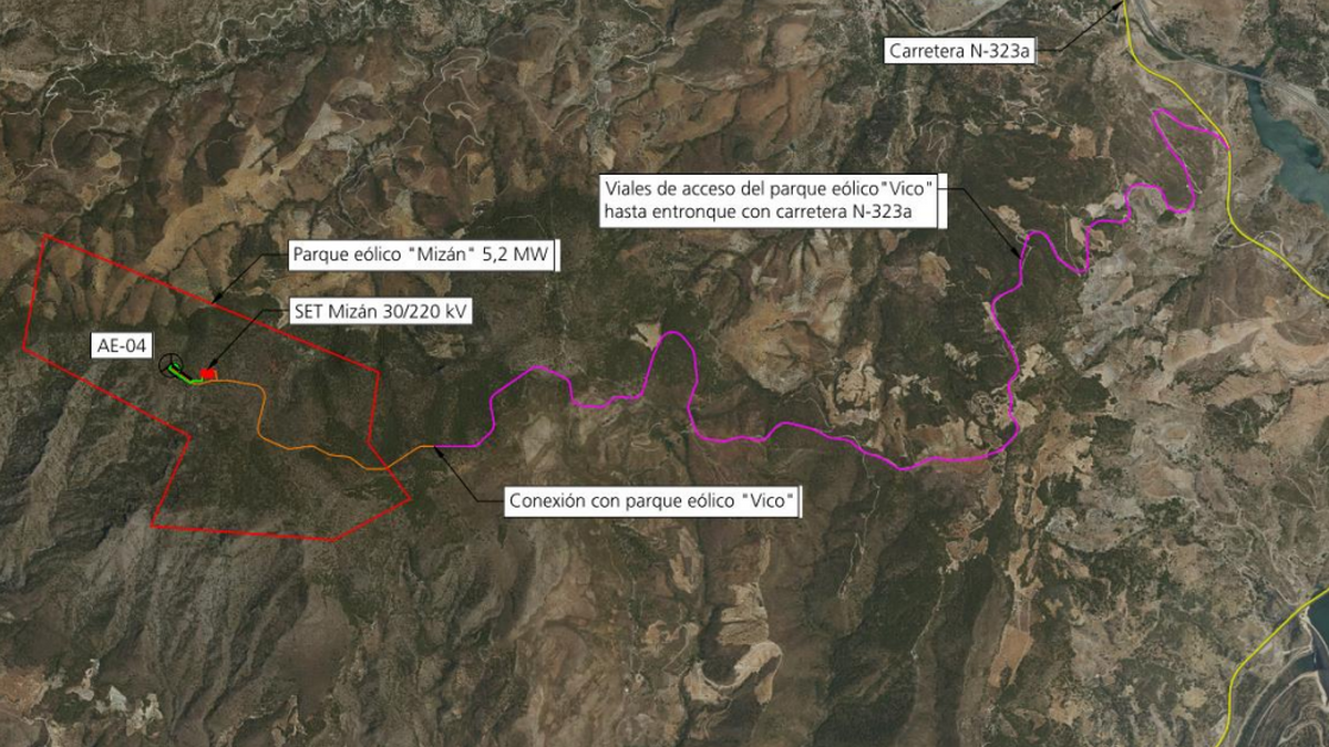 En el mismo se explica igualmente que "los Parques Eólicos de Mizán y Vico evacuarán a la subestación subestación Colectora prefabricada de Saleres 220 kV". La energía generada será transformada por dicha subestación y evacuada mediante línea aérea de 220 kV hasta la subestación SE Saleres 220 kV, perteneciente a Red Eléctrica de España (Redeia), y único proyecto superviviente del frustrado eje de alta tensión Alpujarra-Valle de Lecrín desde Almería. En este las centrales de generación tienen el permiso de acceso concedido, explica el BOJA. La subestación ocupará una superficie de 5.287,4 metros cuadrados.