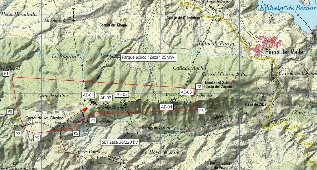 Dos de los parques, denominados Mizán y Vico, con sus cinco turbinas eólicas cada uno, se distribuirán por la Sierra de los Guájares, mientras que el tercero, Zaza, ocupará la zona de cumbres de la llamada cuerda de la Chinchirina, una zona montañosa que empieza justo encima de Pinos del Valle, en la ermita del Cristo del Zapato, y termina en el pico Giralda, el más emblemático de Albuñuelas (1.431 metros de altitud).