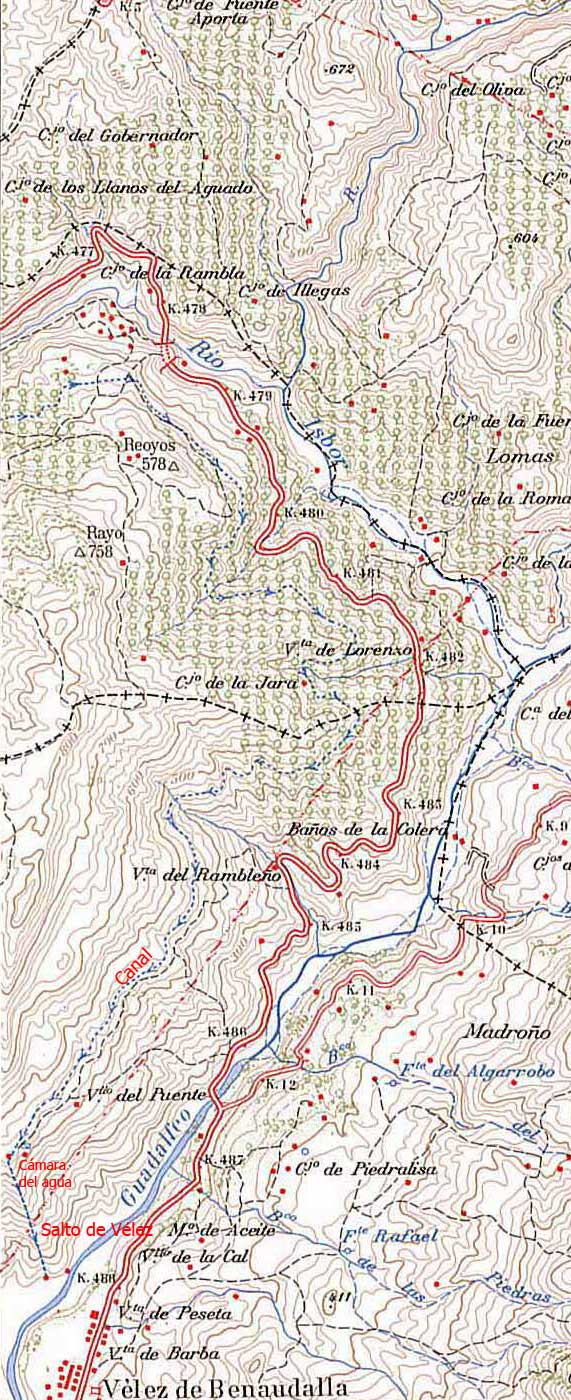 Hemos tomado un mapa de 1975 donde se aprecia bien como el canal van paralelo al río hasta terminar en Vélez