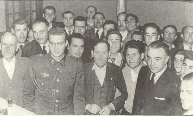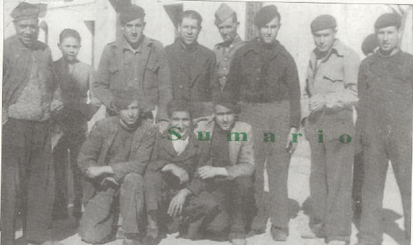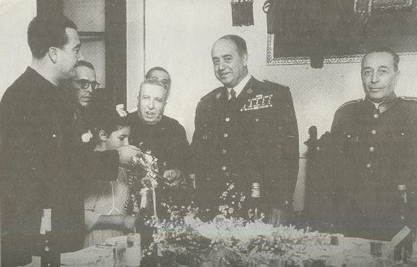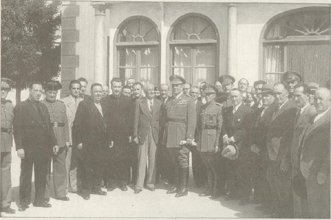 En la foto de arriba, junto al general Lázaro, podemos observar a: Juanito Ortiz, Cepero, Vicente Gutiérrez, Juan Ronco, José Robles, José Puerta, Juan Tamayo, Molina el de la gasolina, Antonio Martín, Ángel Fernández, Antonio Caba, Celestino Echevarría gr.), José Rosales, Federico Castillo, Francisco Martín, José Melguizo. En la foto de abajo, un momento de la entrega del espadín, en recuerdo de Dúrcal, en presencia del Gobernador militar, el alcalde José Puerta Molina, don Celestino Echevarría y don Rafael Ponce de León.