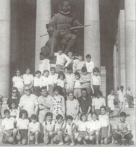 Era el año 69-70 cuando este grupo de afortunados estudiantes tuvieron la suerte de realizar el segundo viaje de estudios que se celebraba en el pueblo de Dúrcal. La foto fue tomada en la puerta del Museo del Prado por Carmencita, hija de Don José, por aquel entonces alcalde del pueblo y director de las escuelas de Balina. En ella podemos ver de arriba abajo y de izquierda a derecha: Juan José, Paco Medina, Antonio López, José Melguizo, Graci Muñoz, Tere Jiménez ('La Torres"), Tere ( actual concejala de urbanismo), Estrella Puerta Calvente, Almudena, Encarnita Ríos, Antonio Petate, Paco Melguizo, Juan Arias, Maria Ángeles( hija de "Oreilla"), Doña Adela y su esposo Don José (alcalde de Dúrcal), Don Mateo y su mujer Doña Julia, Doña Emilia y su marido Don Manuel, Ani ("la de los futbolines"), Cloti, Encarnita Correas, Antoñita ("la del Pío Pío"), Maria Cruz Vilchez, Irene (hija del profesor Jose Enrique), Rosa Pilar Penela, Chelo, Amelia, Begoña, Pili Montes y Antonio Fajardo ("Porretas'"). |