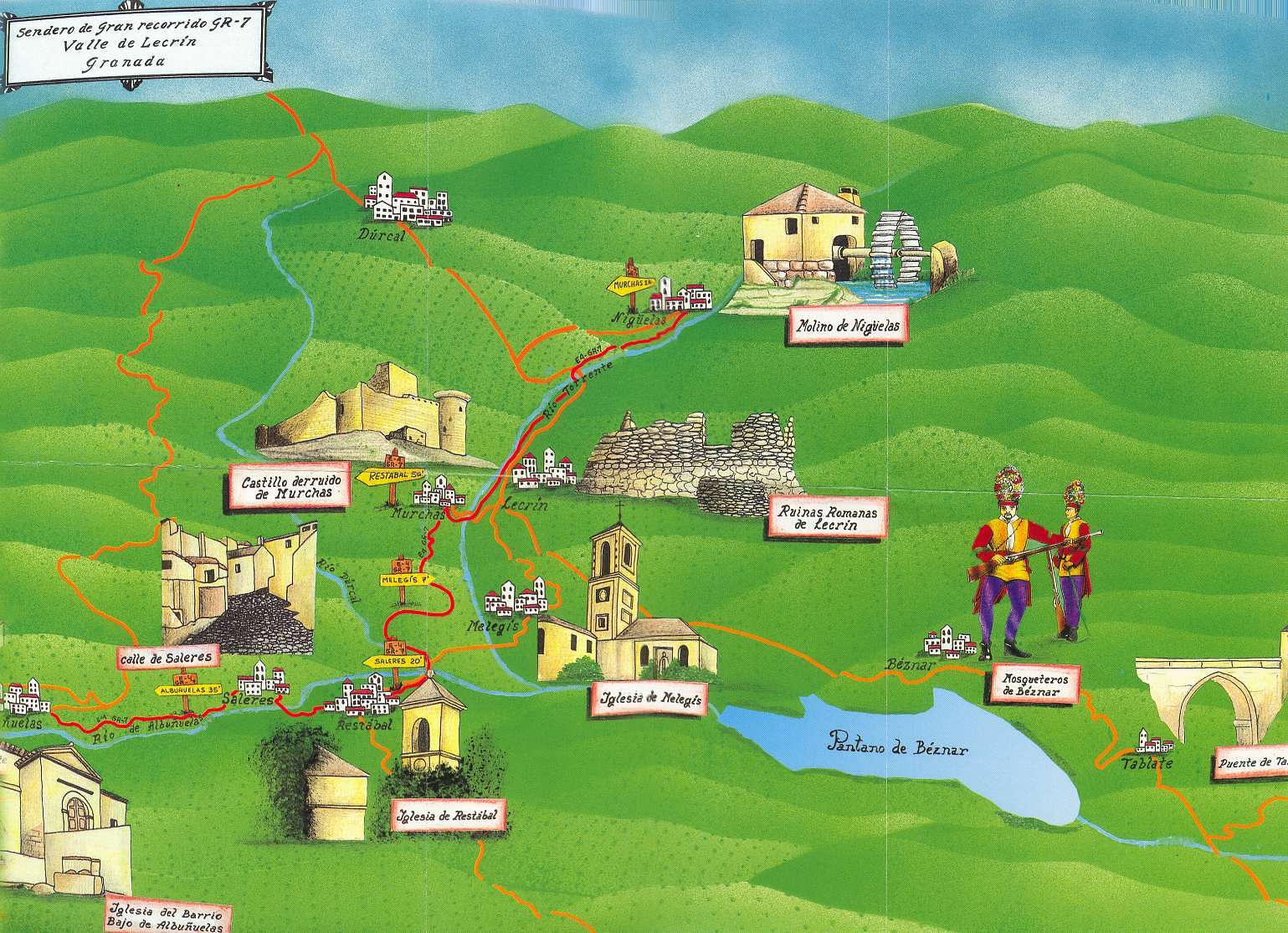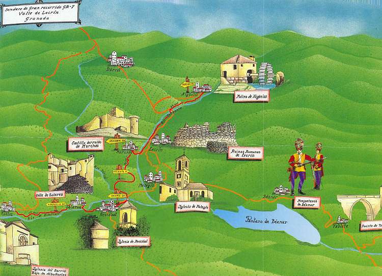 Vamos a proponer, recorrer el sendero GR-7 entre las poblaciones de Nigüelas y las Albuñuelas. Aunque cabe advertir al senderista que si desea conocer en toda su diversidad paisajística el Valle de Lecrín debería remontarse a cotas serranas más altas próximas a los 1.200 metros de altura, hasta el paraje conocido como Pedro Calvo y desde allí iniciar su viaje descendente en busca de la confluencia de los ríos Dúrcal, Albuñuelas y Torrente en pleno centro geográfico del Valle. Además esta sugerencia posee el aliciente de que encontrándonos en este lugar en días claros, podemos divisar el mar.
