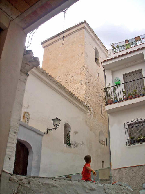 La torre sencilla, tiene un cuerpo prismático sin ningún adorno, mostrando parches y reparaciones en sus muros