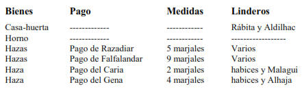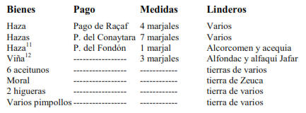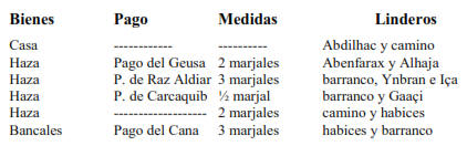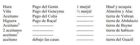 Haza Pago del Caria 4 marjales Abuzeyd y Alhafa Hazas Pago del Cudia 4 marjales Varios Haza Pago del Ardic 3 marjales acequia y Alçaguer Hazas Pago del Ardia 7 marjales Varios Haza Pago del Gima 2 marjales acequia y habices Hazas Pago de Raçaf 4 marjales acequia y Abenfarax