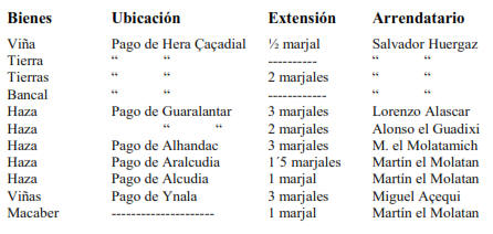 Otras dos viñas y un jorfel se encontraban en el Pago de Ynala, de tres marjales, poco más o menos, alindan con viñas de Juan el Negro y por la parte de arriba con una haza calma de Martín el Molatan, estas tierras de viñedo estaban arrendadas a Miguel Açequi pero no sabemos nada sobre el precio que pagaba por ellas.