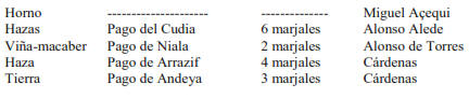 En el Pago de Arrazif encontramos cuatro marjales plantados de olivos en una de las hazas que alindan por uno de sus lados con posesiones de Alonso Alascar y por otro con heredades de Zacarías Modor. Estaba arrendada al morisco llamado Cárdenas. Este mismo morisco tiene acensuado otro pedazo de tierra, de tres marjales de extensión, con algunos olivos que suman en total veinte plantas, poco más o menos. Estaba en el Pago de Andeya. Alinda por un lado con una haza de Gonzalo Barrad y por otro con tierras de Baltasar Chumaycan. No sabemos nada sobre el censo que pagaba por estas tierras.