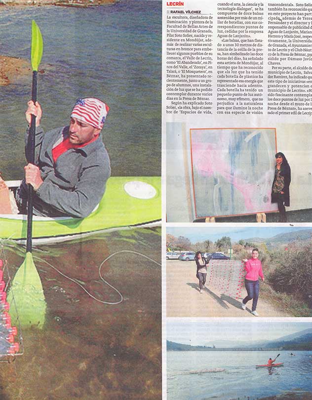 "Las balsas, que han flotado a unos 30 metros de distancia de la orilla de la presa, han simbolizado las doce horas del día", ha señalado esta artista de Mondújar, al tiempo que ha reconocido que "la luz que ha tenido cada botella de plástico ha representado esa energía que trasciende hacia adentro. Cada botella ha tenido un pequeño punto de luz autónomo, muy efímero, que no perjudica a la naturaleza para que ilumine la noche con esa especie de visión trascendental". Soto Solier también ha reconocido que en este proyecto han participado, además de Teresa Fernández y el director y la responsable de publicidad de Aguas de Lanjarón, Mariano Herrero y Mana José, respectivamente, la Universidad de Granada, el Ayuntamiento de Lecrín y el Club Náutico de la Presa de Béznar, presidido por Dámaso Javier Chaves.
