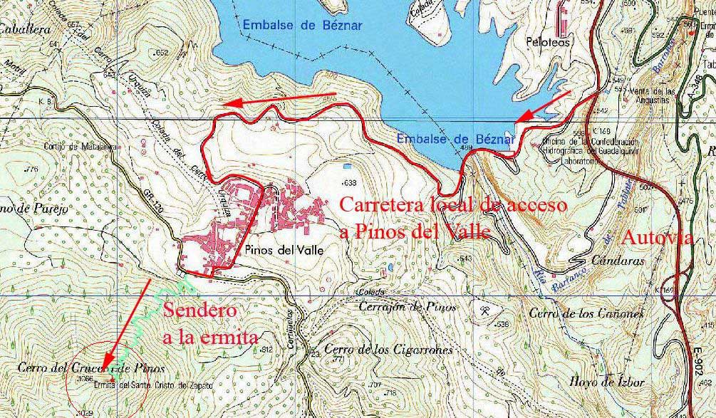 Se puede acceder a través de la autovía, cruzando por el dique del pantano, se sube hasta el pueblo y tras saludar al abanderado se dirige uno hacia el Barrio Alto. Hasta quí se puede hacer en vehículo. El sendero marcado de verde hay que hacerlo a pie