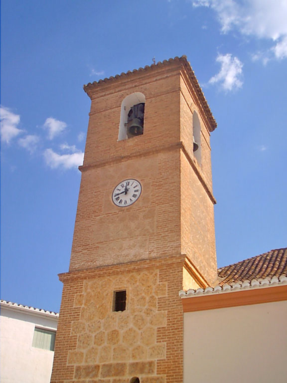 La torre tiene planta cuadrada y machón central en el primer cuerpo, que es lo primitivo, lo cual es signo de antigüedad; el cuerpo de campanas lleva varios lisos