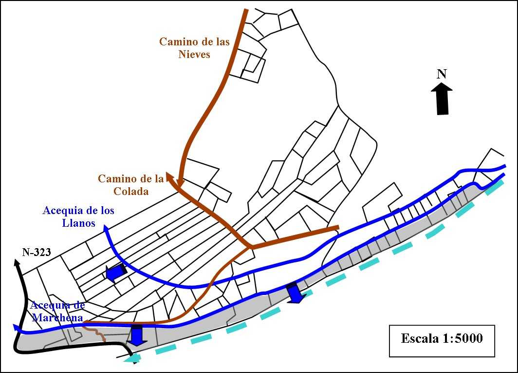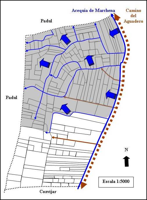 Se riegan 335 hazas de desigual tamaño y datación. A la parte de abajo del Camino de la Laguna, encontramos más propiedades puestas en riego que están dedicadas al olivar extensivo. Sin embargo, entre la acequia y este camino se muestra un pago de tierras muy parcelado y con lindes muy irregulares. Llegando a la Colada, el camino se adapta siguiendo el ramal de riego extraído de la Acequia de Marchena. A partir de ahí, hacia el oeste y hacia el norte, siempre por debajo de la Acequia de Marchena, hay propiedades muy pequeñas que riegan siempre con largos brazales, por turnos y sin orden predeterminado. Riega quien primero coge el agua, y el resto según vayan pidiendo la vez. Entre el Camino de la Colada o Cañada de Marchena por el este, la acequia por el norte y el lindero de Padul encontramos dos zonas irrigadas por una bifurcación de la Acequia de Marchena. Una de ellas discurre por el Camino de los Olivares y proporciona agua hasta el camino del Aguadero a cien propiedades. La otra ramificación discurre paralela a la N-323 en su lado sur y da riego a ciento ocho fincas. La eficacia del sistema actual queda mermada por el abandono del cultivo de las fincas, originando que el agua pase por el lado de muchas de ellas, sin ser utilizada.