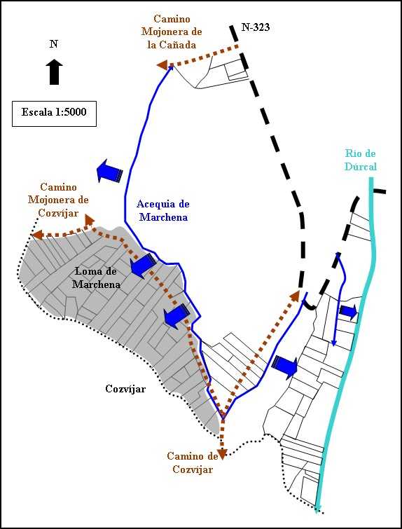 El sistema original comprendía las hazas más cercanas a la acequia que, como podemos ver, son más irregulares que las parcelaciones más modernas. Se regaba y se sigue haciendo desde el Camino de la Mojonera de Dúrcal por el este, tomando como referencia el Camino de la Laguna, hasta el Camino del Aguadero a Cozvíjar. La Acequia de Marchena va sacando ramales hacia abajo (dirección sur-oeste), con el brazal de la Loma, pasando por el Camino de la Colada y siguiendo por el Camino de los olivares que llega hasta la linde con el término de Padul.