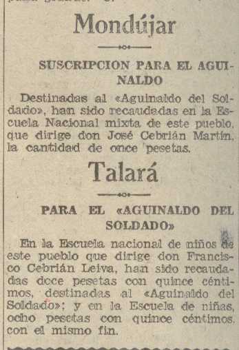 22 de diciembre de 1936. Recaudado el aguinaldo para el soldado en las escuelas de Mondújar que dirige Don José Cebrián Martín y en la de Talará dirigida por Don Francisco Cebrián Leiva