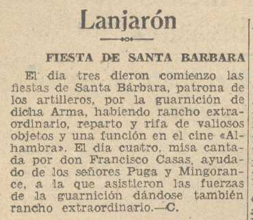 6 de diciembre de 1936. Fiesta de Santa Bárbara en Lanjarón, patrona de los artilleros, por la guarnición de dicha arma. Hubo una función en el Cine Alhambra
