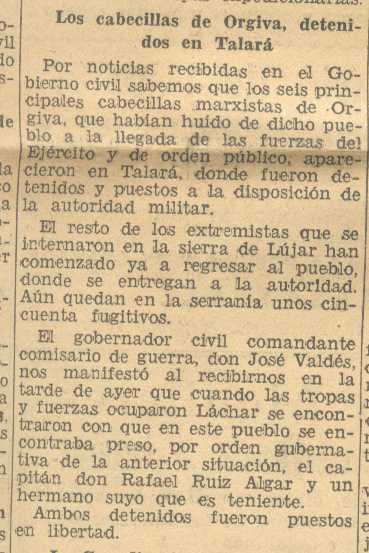 23 de julio de 1936. Detenidos en Talará izquierdistas de Órgiva que había huido del pueblo, otros se refugian en la sierra de Lújar