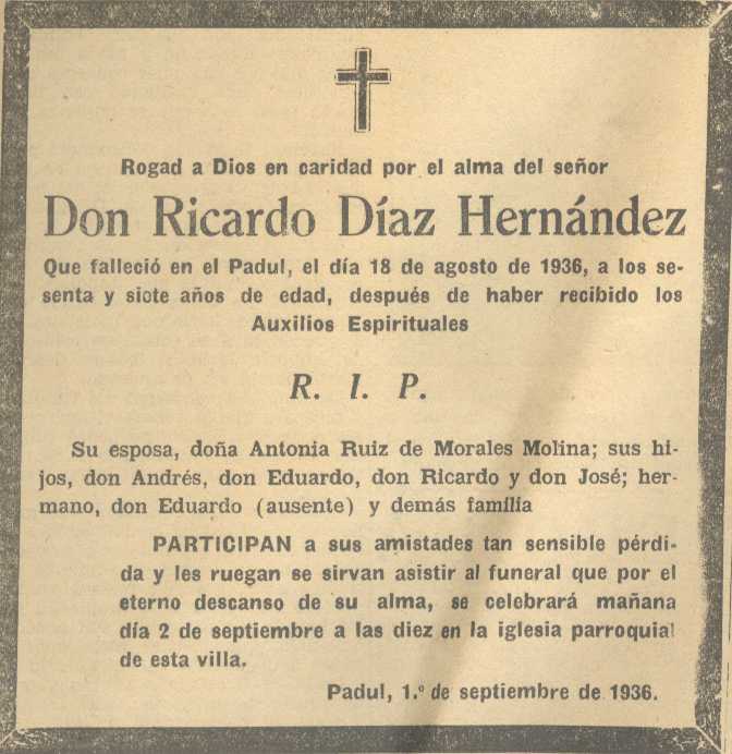 1 de septiembre de 1936. Fallece en Padul Don Ricardo Díaz Hernández