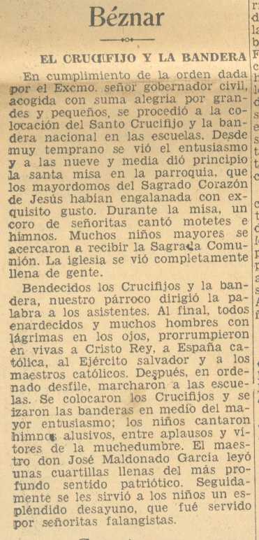 11 de septiembre de 1936. Se restablece el crucifijo y bandera nacional en las escuelas de Béznar. Maestro Don José Maldonado García