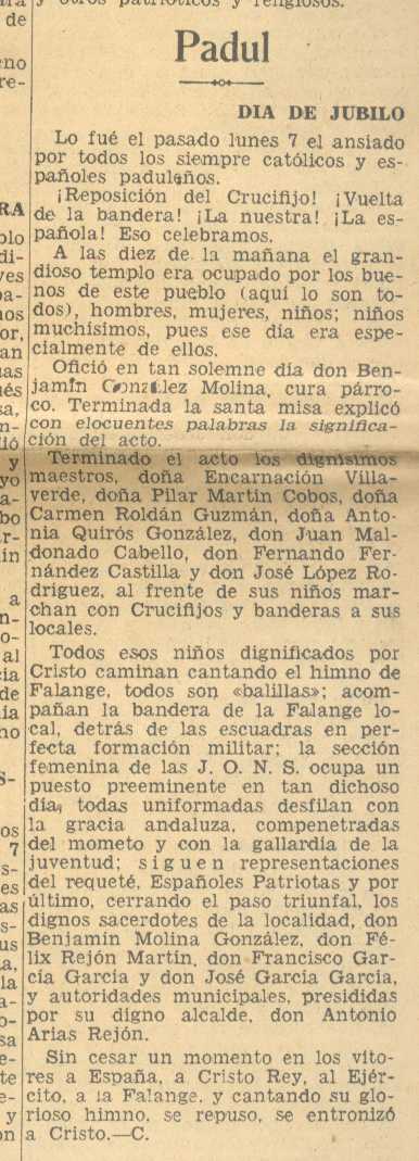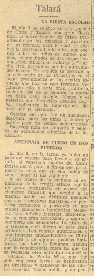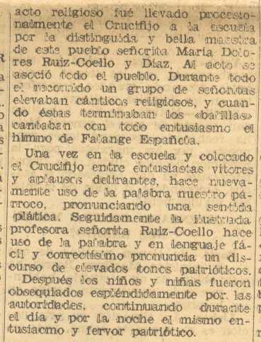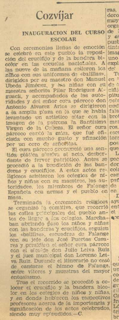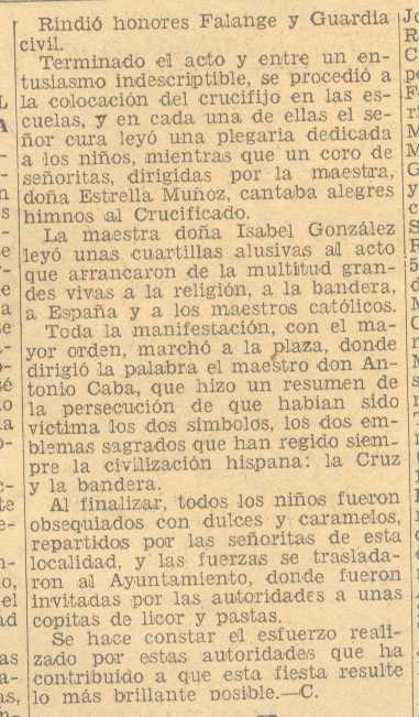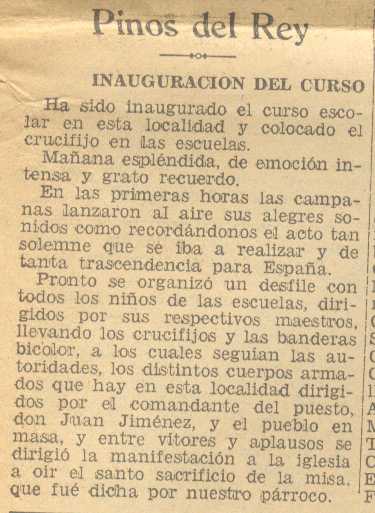 23 de septiembre de 1936. Se inaugura el curso escolar en Pinos del Rey y se coloca el crucifijo en las escuelas. Comandante del puesto Don Juan Jiménez. Maestras Doña Estrella Muñoz y Doña Isabel González, maestro Don Antonio Caba