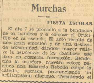 12 de septiembre de 1936. Se coloca la bandera y el crucifijo en la escuela de Murchas. Párroco Don Eduardo Rebollo