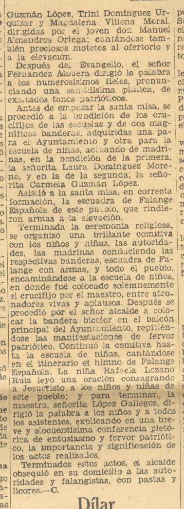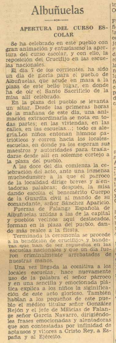 15 de septiembre de 1936. Se abre el curso escolar en las escuelas de Albuñuelas y se repone el crucifijo. Médico González Rejón, Jefe de la Falange García Navarro