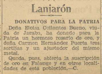 18 de septiembre de 1936. Donación para la Patria en Lanjarón: Doña Eloisa Collantes Bueno viuda de Jaraba un rosario de oro y Doña Carmen Hernández Puerta tres sortijas y un ajustador también de oro