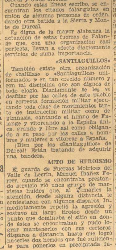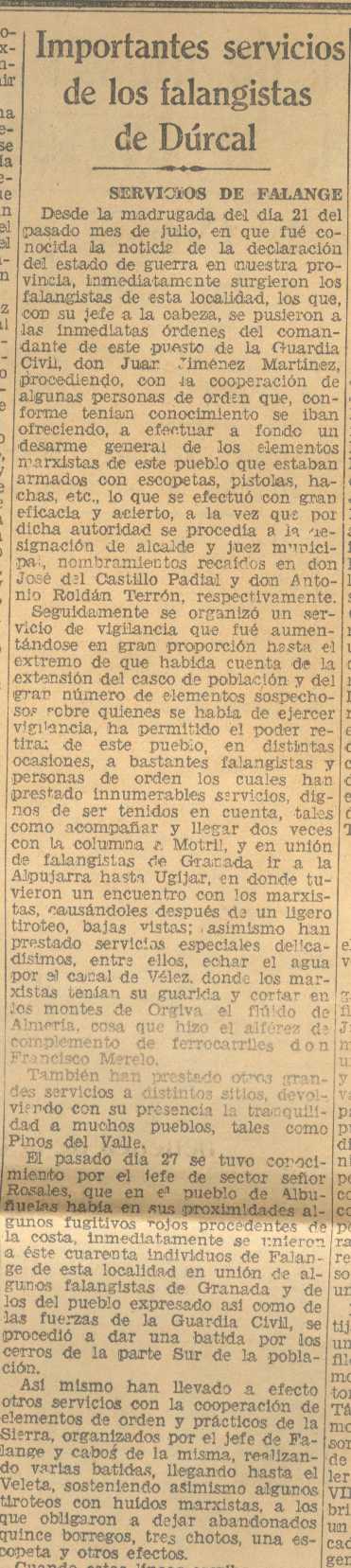 2 de septiembre de 1936. Tras declararse el estado de guerra el 21 de julio los falangistas de Dúrcal se pusieron al mando del comandante del puesto de la guardia civil Don Juan Jiménez Martínez, desarmando a los marxistas de esta población. Fue nombrado alcalde Don José del Castillo Padial y juez municipal Don Antonio Roldán Terrón. Formaron un servicio de vigilancia en el pueblo y tuvieron tiempo de llegar dos veces con la columna a Motril, fueron a la Alpujarra hasta Ugíjar, Echaron el agua por el canal de Vélez, cortaron la electricidad que iba a Almería, estuvieron vigilando en Pinos del Valle, hicieron batidas en la sierra de Albuñuelas para buscar marxistas, También dieron batidas hasta el veleta y por la sierra y dehesa de Dúrcal. Hay una organización de niños falangistas denominada "Santiaguillos". El Guarda de Fuerzas motrices del Valle de Lecrín Don Manuel Ibáñez Ferrer también ayudo ahuyentando marxistas
