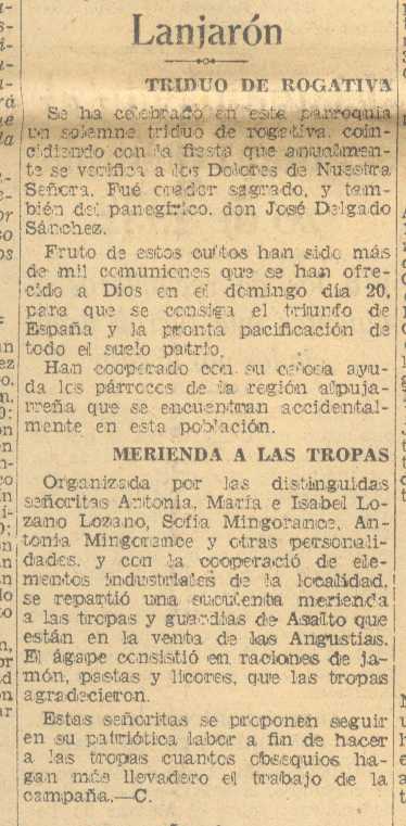 26 de septiembre de 1936. Triduo de rogativa en Lanjarón. Orador Don José Delgado Sánchez. Se les da una merienda a las tropas de asalto que están en la Venta de las Angustias