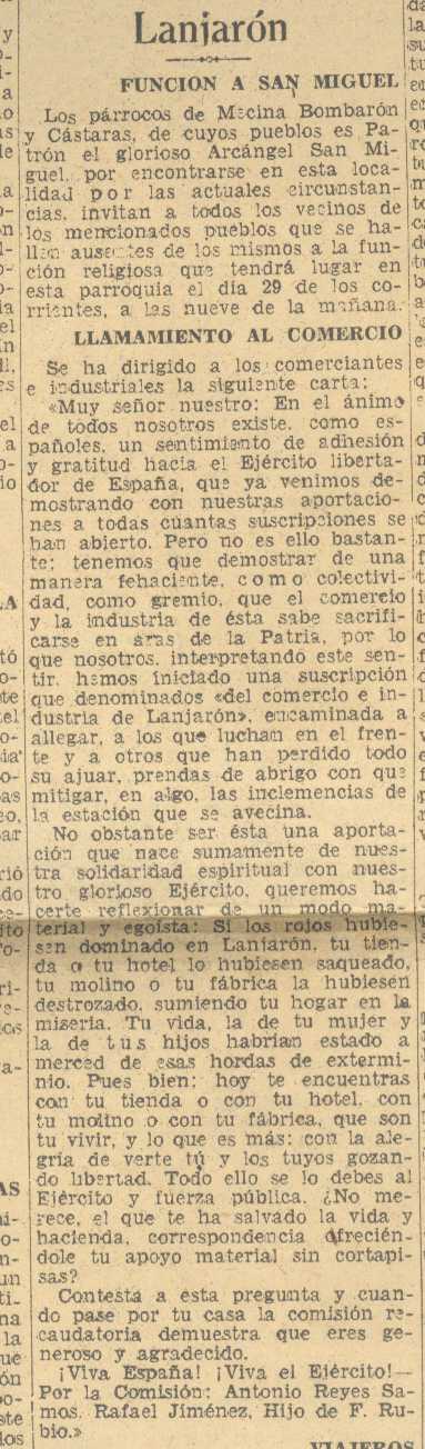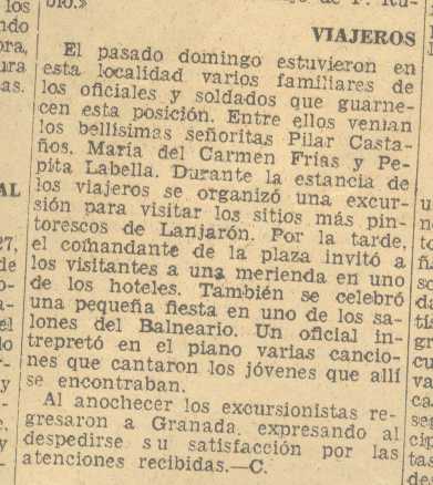 30 de septiembre de 1936. Función a San Miguel en Lanjarón. Se les pide una aportación para la guerra a los comerciantes locales a través de una carta. Los familiares de oficiales y soldados que guarnecen esta posición asistieron a un homenaje y fiesta en el balneario
