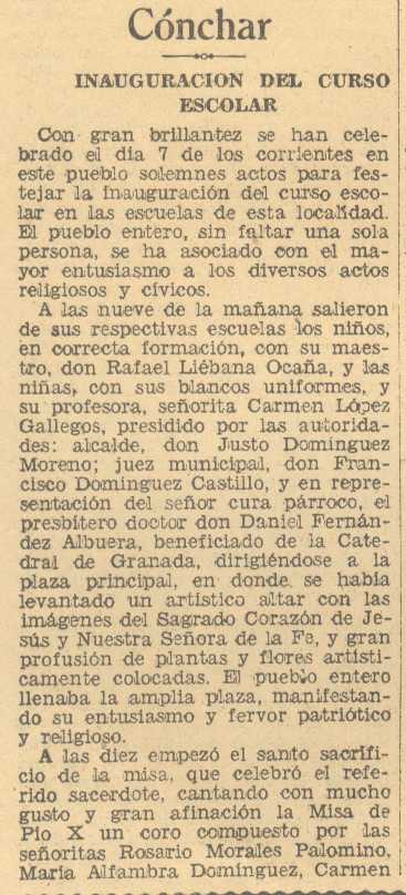 9 de septiembre de 1936. Inauguración escolar en Cónchar. Maestro Don Rafael Liébana Ocaña. Maestra Doña Carmen López Gallegos. Alcalde Don Justo Domínguez Moreno. Juez municipal Don Francisco Domínguez Castillo