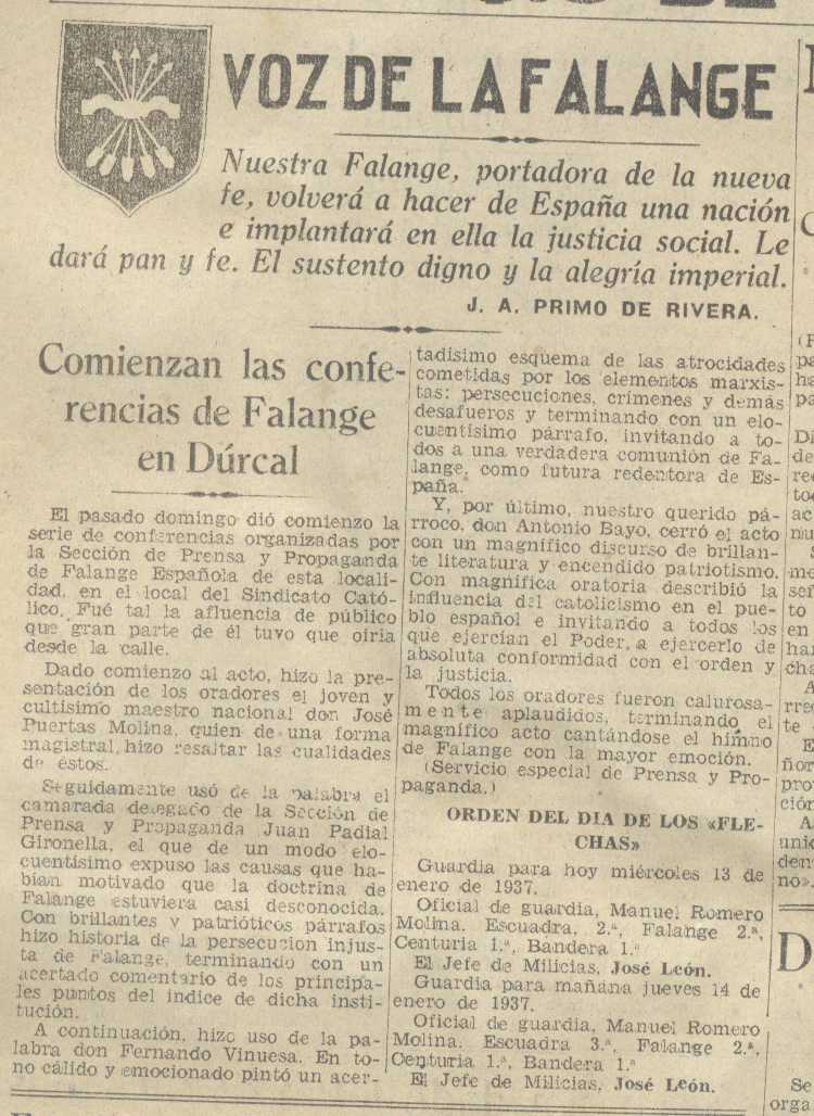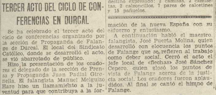 13 de enero de 1937. Comienzan las conferencias de Falange en Dúrcal, en el sindicato católico. Orador el maestro Don José Puerta Molina, Juan Padial Gironella, Don Fernando Vinuesa y cerrando el acto el párroco Don Antonio Bayo
