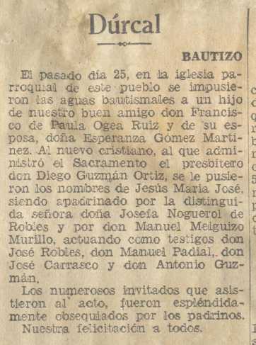 2 de enero de 1937. Bautizado en Dúrcal el hijo de Don Francisco de Paula Ogea Ruiz y Doña Esperanza Gómez Martínez