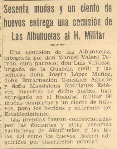 28 de enero de 1937. Sesenta mudas y un ciento de huevos entrega una comisión de las Albuñuelas al Hospital Militar. Cura Don Manuel Valero Terrón