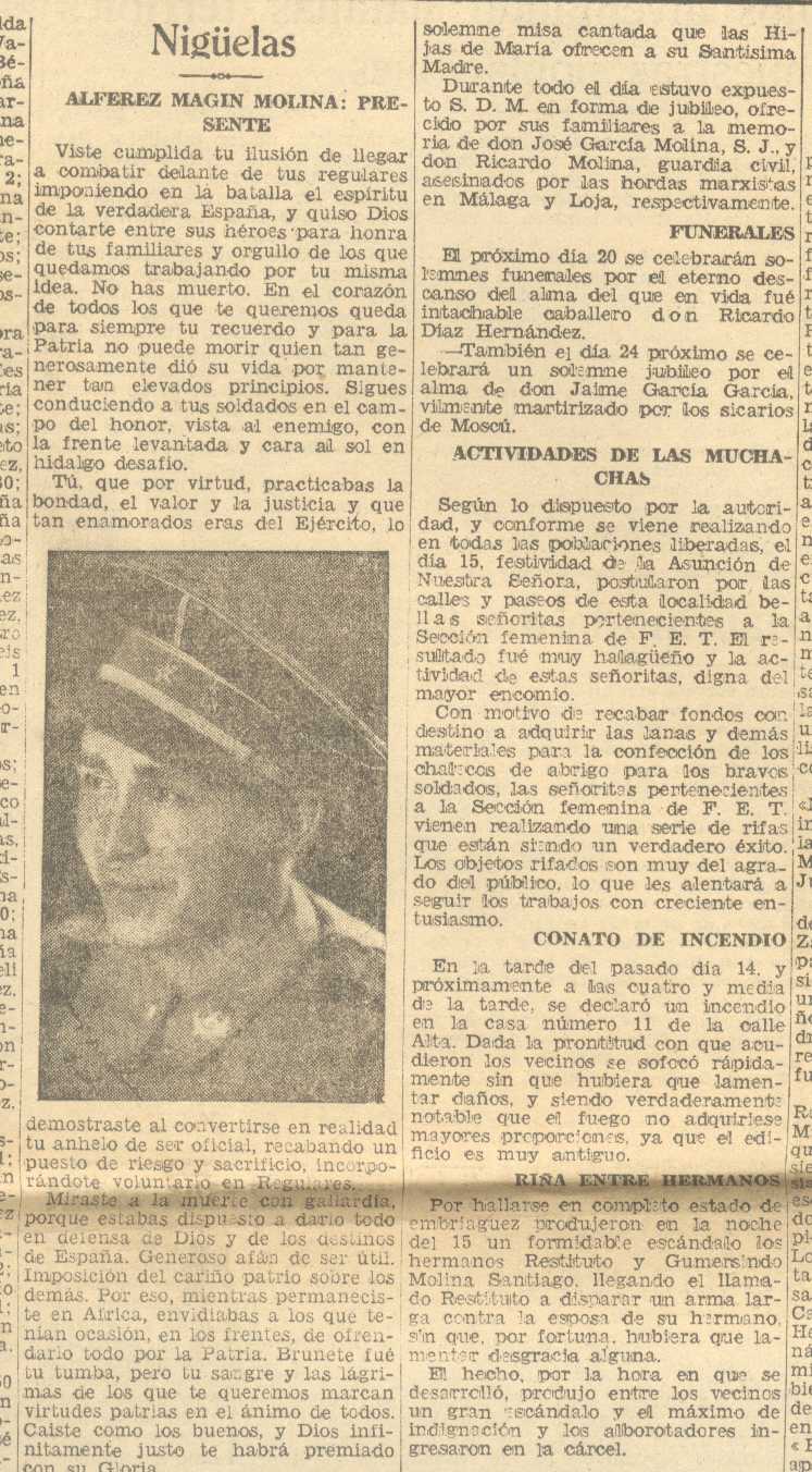 17 de agosto de 1937. Nigüelas. Muere el alférez Magín Molina. Enlace matrimonial de Doña Encarnación Rica Robles y Don Francisco López Casares