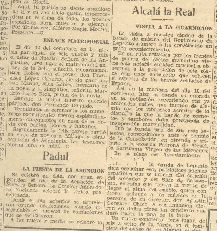 17 de agosto de 1937. Fiesta de la Asunción en Padul. Se celebrarán los funerales por el que fue párroco del pueblo Don Ricardo Díaz Hernández. Recaudación de fondos de la Sección Femenina. Conato de incendio en la casa número 11 de la calle Alta. Riña entre dos hermanos