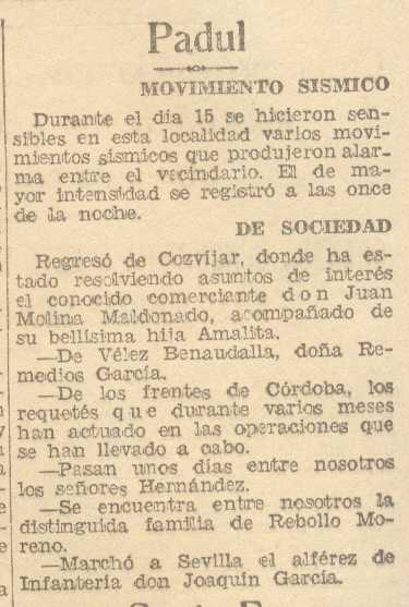 18 de agosto de 1937. Movimientos sísmicos en el Padul. Crónicas de sociedad