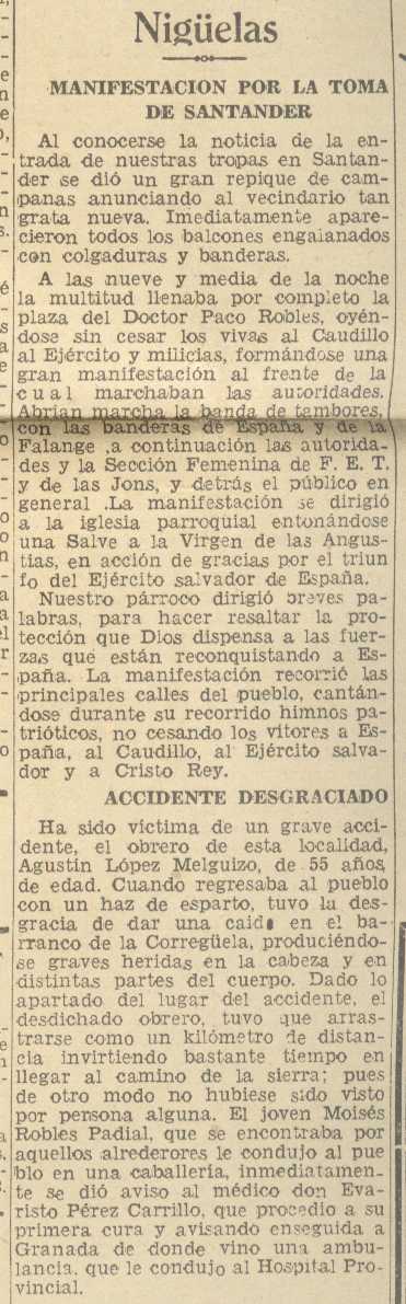 29 de agosto de 1937. Manifestación en Nigüelas por la toma de Santander. Tiene un accidente Don Agustín López Melguizo