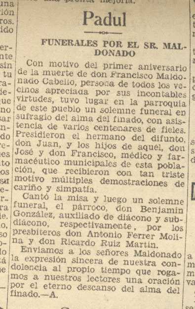 14 de septiembre de 1937. Funerales al cumplirse un año de la muerte de Don Francisco Maldonado Cabello del Padul. Párroco Don Benjamín González