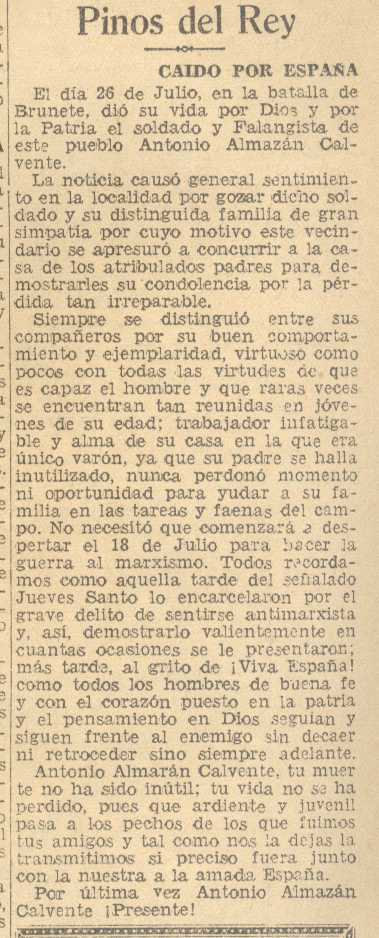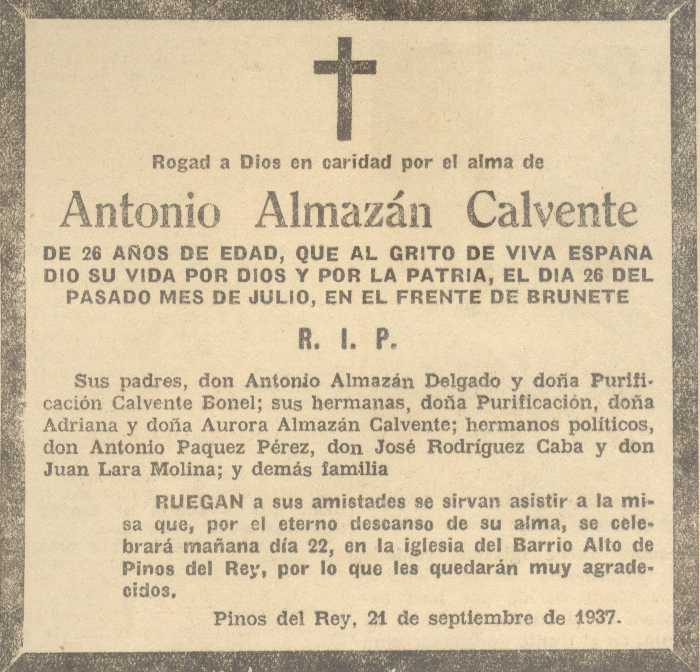21 de septiembre de 1937. Fallece en Pinos del Rey Don Antonio Almazán Calvente