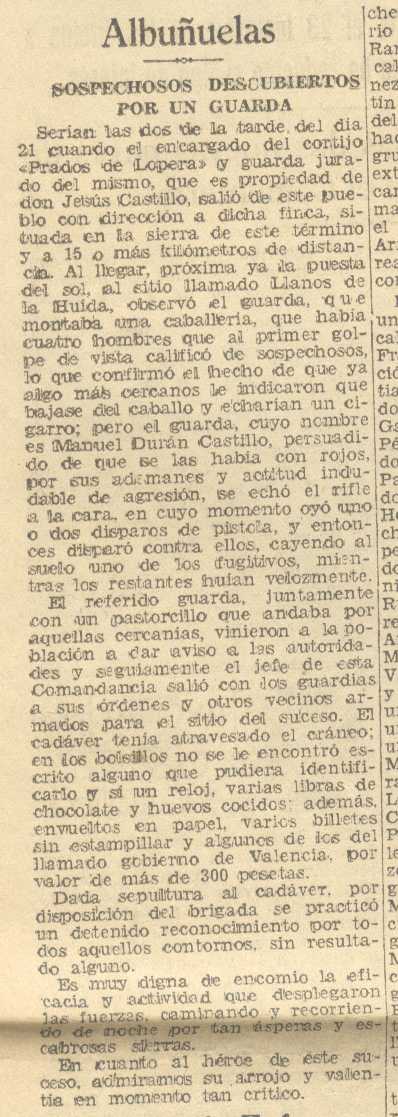 25 de septiembre de 1937. Un guarda Don Manuel Durán Castillo de Albuñuelas termina matando a un rojo en los Prados de Lopera