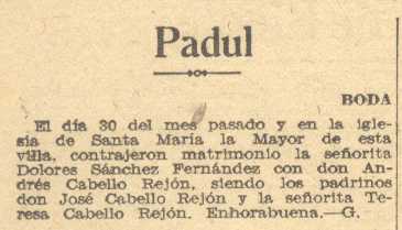 1 de octubre de 1938. Boda en el Padul de Doña Dolores Sánchez Fernández y Don Andrés Cabello Rejón