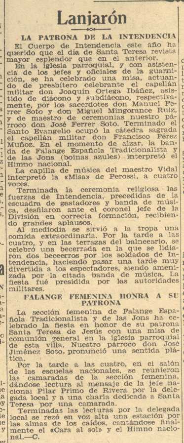 18 de octubre de 1938. Festejada en Lanjarón la patrona de la Intendencia. La sección femenina ha celebrado también su patrona